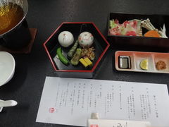 夕食です。左右に鍋と鉄板があります。加太の方もそうですが、和歌山は「お品書き」があるのがよいです。よい旅の思い出になります。生クラゲの酢味噌、スナップエンドウ、ちまき、鮎の五色あられ焼き、蛸桜煮など、国産牛レタス鍋になります。