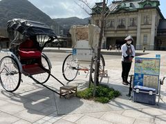出発時、わざわざプレミアホテル門司港の玄関まで人力車でお迎えに着て下さり有り難く思います。母と2人での旅行なので、ゆったりと門司港レトロを見学したいとお願いしていましたので、少々ゆっくり人力車を引いて頂きました。小雨が止むと幌を外して下さり、全体が大きく見渡せるように心配りをして頂いたり、また小雨まじりになると、幌を調整してくださったりして、小雨でも全く気になりませんでした。(人力車、雨だったらどうしようと思う方、よほどの大雨でなかったら心配入りませんよ。)途中、旧下関税関に立ち寄って下さり、歴史的建物も拝見出来ました。母を思ってか道路の段差には常に気を配って下さり、一声出しながらご案内頂きました。人力車引く方もずっと前ばかり見て話しをされるのかと思いましたが、途中立ち止まってこちらを振り向いてお話をして下さったり、母も門司の話に聞き入っていました。係りの方がお話が丁寧なのもありますが、歴史に関する知識が本当に詳しい事。大変勉強されているのかと思います。真下で見た関門橋は、スケールが違いました。波の速さとか小さい頃の体験談なども踏まえて、色々と教えて頂きました。母も興味深く色々尋ねていました。そんな事も一つ一つ丁寧に受け答えしながら、体力使って『人を楽しませて頂ける』のですから、エンターテイナーショウのようです。地元の方(学生さん)も、人力車の方に敬意を持っているようで、『あっ!人力車さんだ』とお声を掛けてくれています。1時間ってあっとゆう間です。この日は予約も少なかったようで大丈夫だったのですが、30分延長して頂けました。ゆったり見たいなと思ったら、90分コースがお薦めです。本当にこちら側の提案に親身に乗って頂けるので、いい思い出が出来ました。母が写真が撮りたいと思うと、止まって下さり一番ベストポジションの所で停まってくれたりとか、本当に心配りが出来ていると感心させられました。なんとなくですが、観光列車に乗って、沿道の方々に手を振って貰えるような楽しさが加味されます。最後ですが、私の体重が重くて申し訳ありませんでした。そんな親子が乗っても座席が狭いと感じる事もなく、門司港レトロを楽しむ事が出来ました。ありがとうございました。