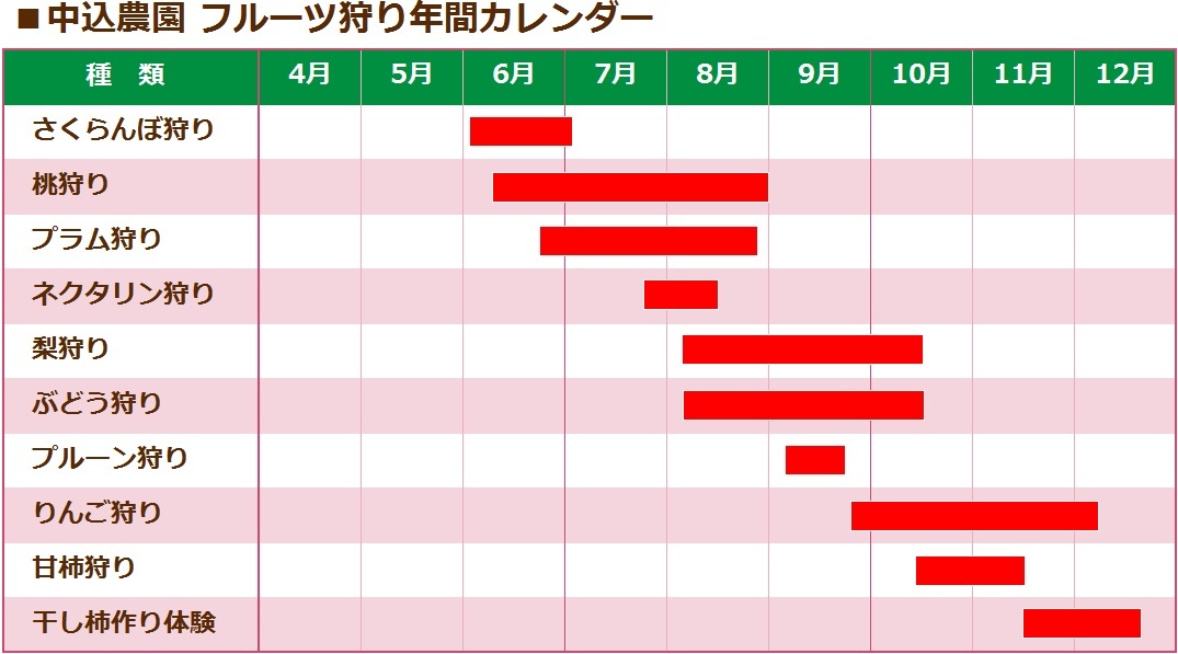 トップクラスで、さくらんぼ・桃・プラム・スィートネクタリン・梨・ぶどう・甘柿・りんごなど、六月初旬〜十二月初旬迄の長い期間に亘って多くの種類のフルーツを楽しんでいただけます。当園の特長でもあるフルーツ狩りセットコースでは例えば八月は桃、プラム、ぶどう、九月はぶどう、りんご、梨といったように1度に2種類以上の果物狩りを楽しむ事ができます。