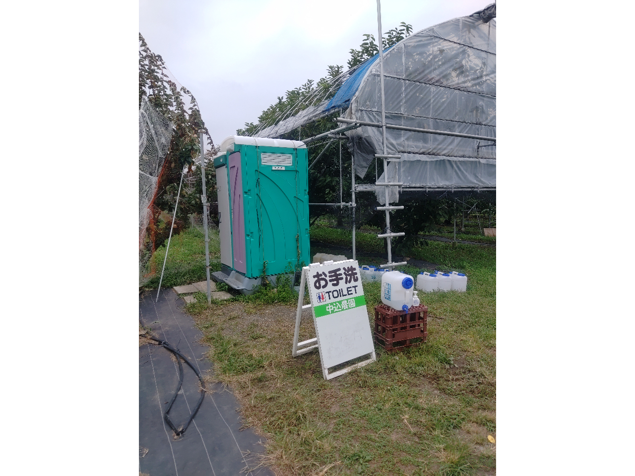 農園には水道はありませんが、お客様が果物を洗う、手を洗う時に利用して頂く為に、私共が自宅の水道水をポリタンクに詰めて軽トラックに載せて何度も往復しています。