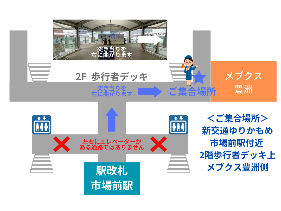 | 集合場所 | 〒135-0061 東京都江東区豊洲6-3 新交通ゆりかもめ市場前駅付近 2階歩行者デッキ上 メブクス豊洲側 ※集合場所の詳細はお申込み後にメールにてご案内いたします。 |