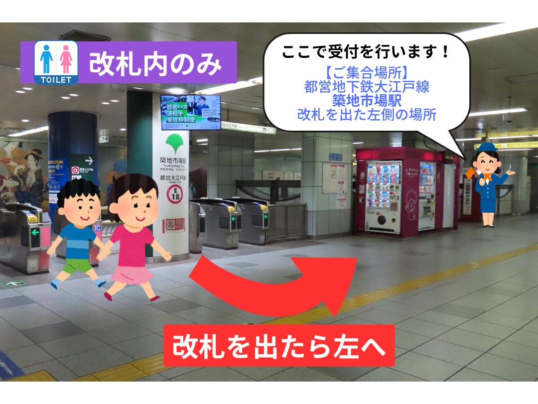 | 集合場所 | 〒104-0045 東京都中央区築地5-1-2 都営地下鉄大江戸線 築地市場駅改札口出たところ 左側(※改札はひとつです) |