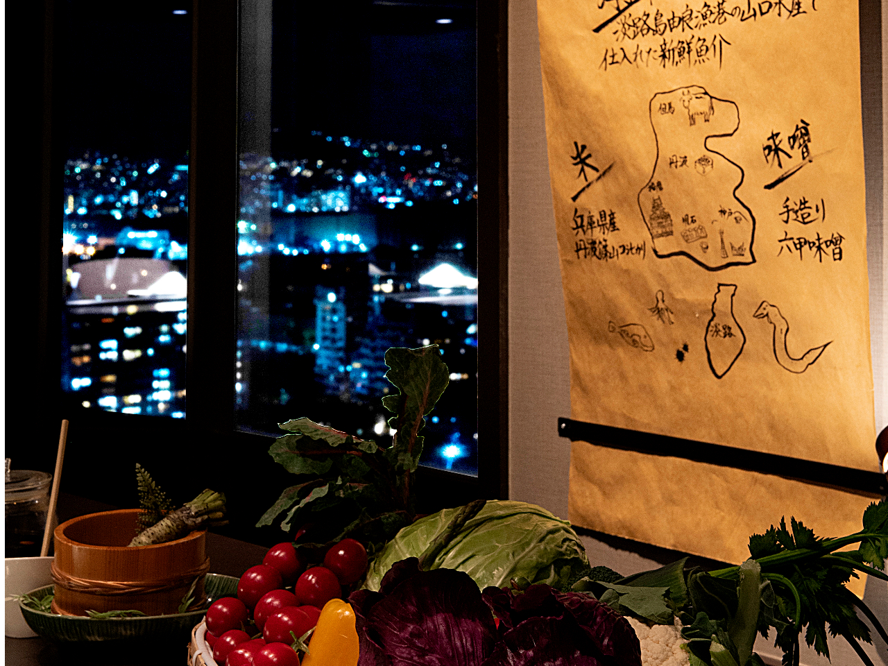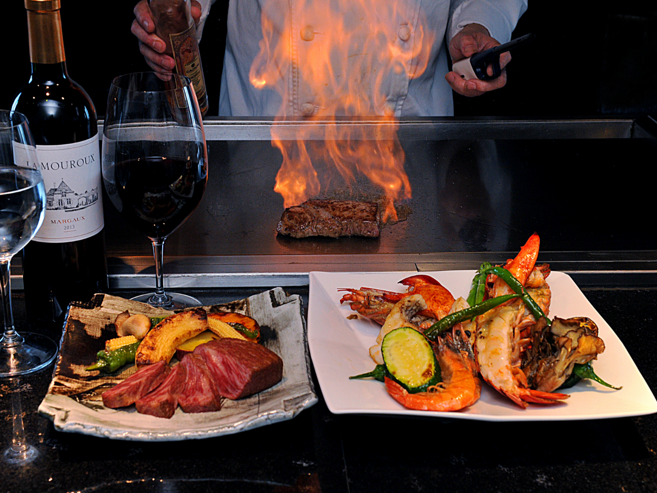 神戸牛サーロイン、鮑、鮮魚などを豪快且つ繊細に仕上げる卓越したシェフによるライブパフォーマンスをお楽しみください。特別な日の夜にぜひ。