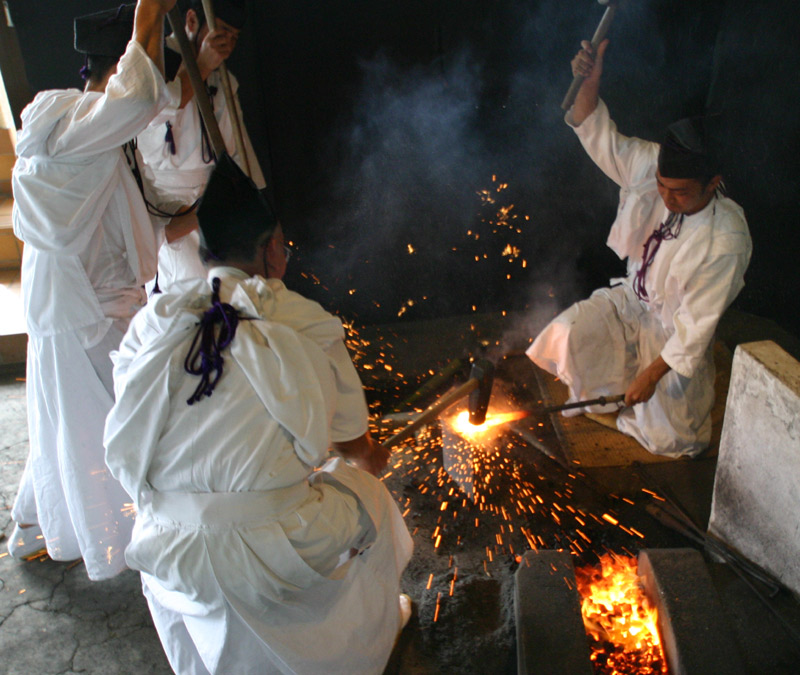 迫力満点!真っ赤になった玉鋼を刀匠が大鎚で打ち、不純物が火花として飛び散る 鍛錬実演は必見です☆☆