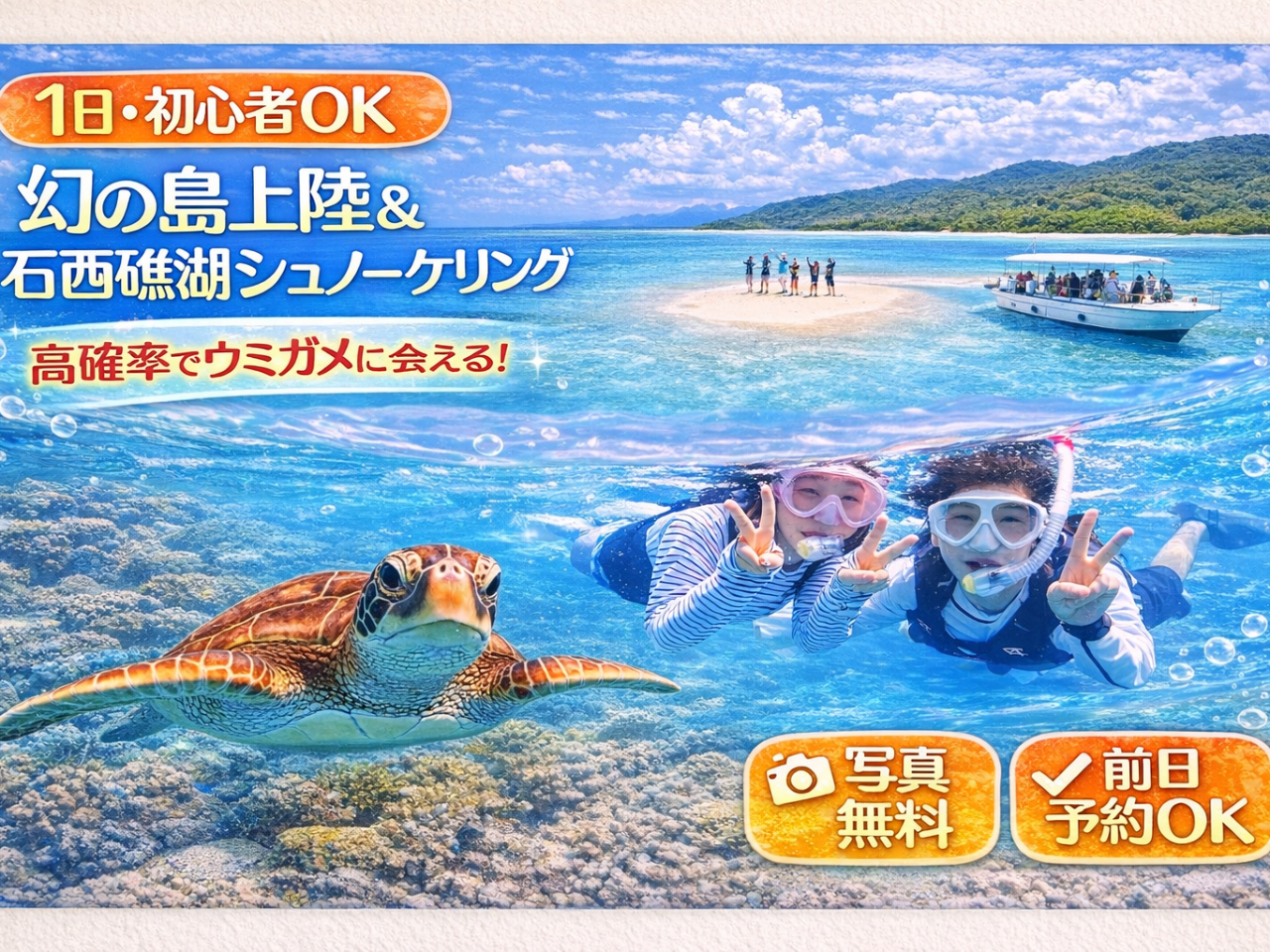 【体験ダイビング&シュノーケリング】ウミガメと泳ぐ夢のような体験を×石西礁湖×幻の島上陸も|石垣島7時間 ・写真無料・手ぶらでOK|前日予約OK