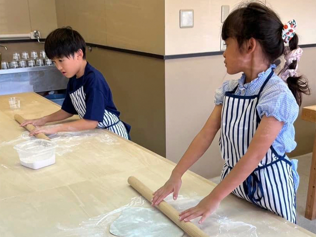 自家製粉したそば粉を使い、専属のそば打ち職人が丁寧に指導します。