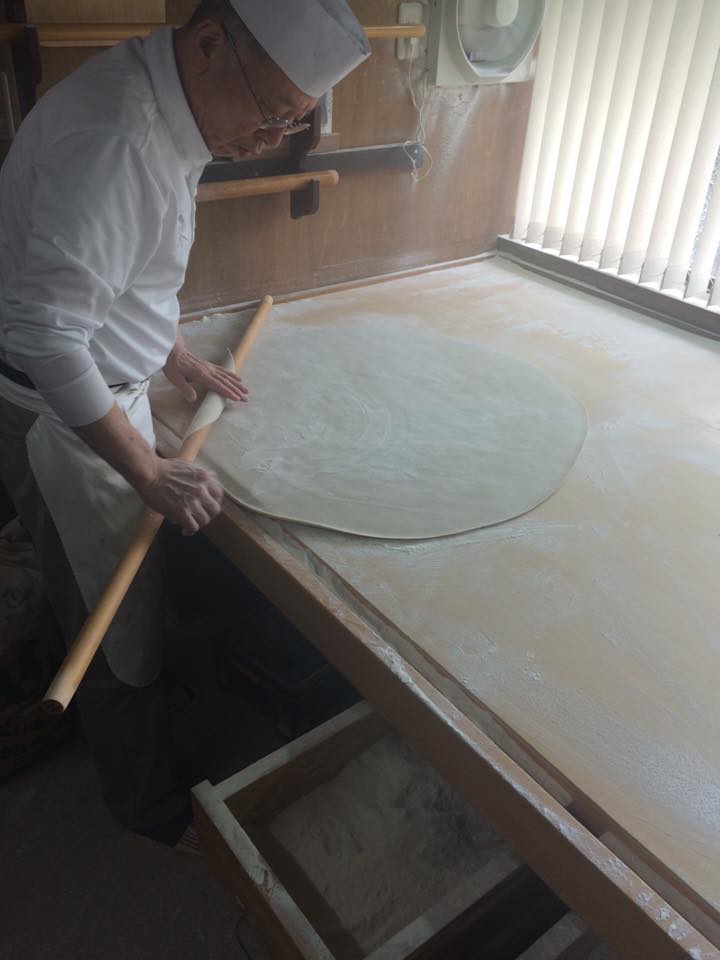 専用の棒を使ってそば玉を均一に伸ばしていきます。