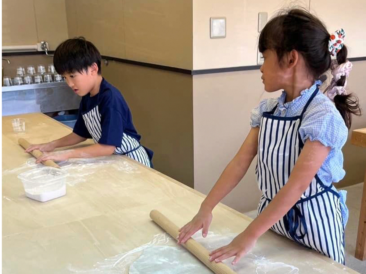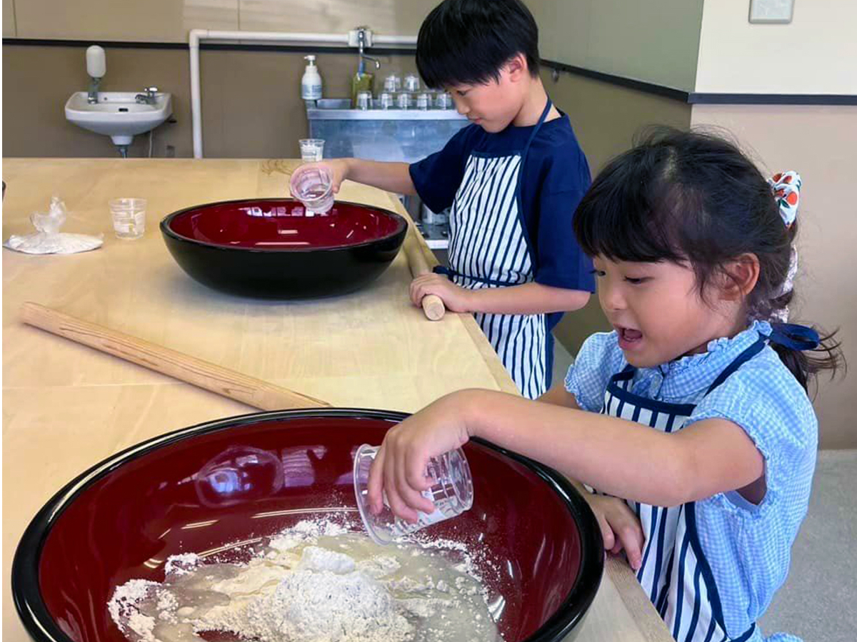自家製粉したそば粉を使い、専属のそば打ち職人が丁寧に指導します。