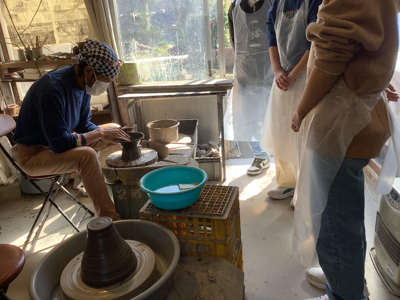講師が電動ろくろでの見本をお見せしながら体験についてご説明いたします♪