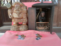 「日吉神=山の神(比叡山、白山)+オオムナチ(縁結びの神。出雲の神)+海の神(宗像3女神)」となる。また「日吉の神遣い=猿」なので狛犬ならぬ狛猿となり、拝殿前にオクニヌシ(大黒天)と神像猿が安置されていた。