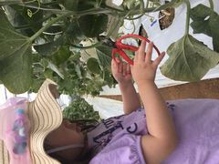大きくない田舎道の直売所のようなところにありました。家族で経営しているところで、まず最初にお金を払うと、直売所の隣でおじいちゃんがメロンの取り方を図を使ってざっくり説明してくれます。それからおじいちゃんと一緒にほんの少しだけ歩いてビニールハウスに行きます。ビニールハウスにつくと入り口にはさみが置いてありハサミを持って入って行きます。おじちゃんは入り口で待っているので、私たちは好きなメロンを1つ見つけてカットしてビニールハウスから出てきます。その間3分程度です。メロンがなっている場所もある程度限られているのでそんなに迷うことなく取れました。いちごがりなどと違ってメロン1個に重みがずしりとあるので子供たちはその重さに喜んでいました。メロンを刈ったあとはそのまま近くにある広場でメロンの試食をしました。主食用は冷えていて甘くておいしかったです。試食をする広場は半分屋外のような形で、天井にぶどうがいっぱいになっていて素敵でした。暑かったですがなかなかできないメロンがりはいい経験になったと思います。