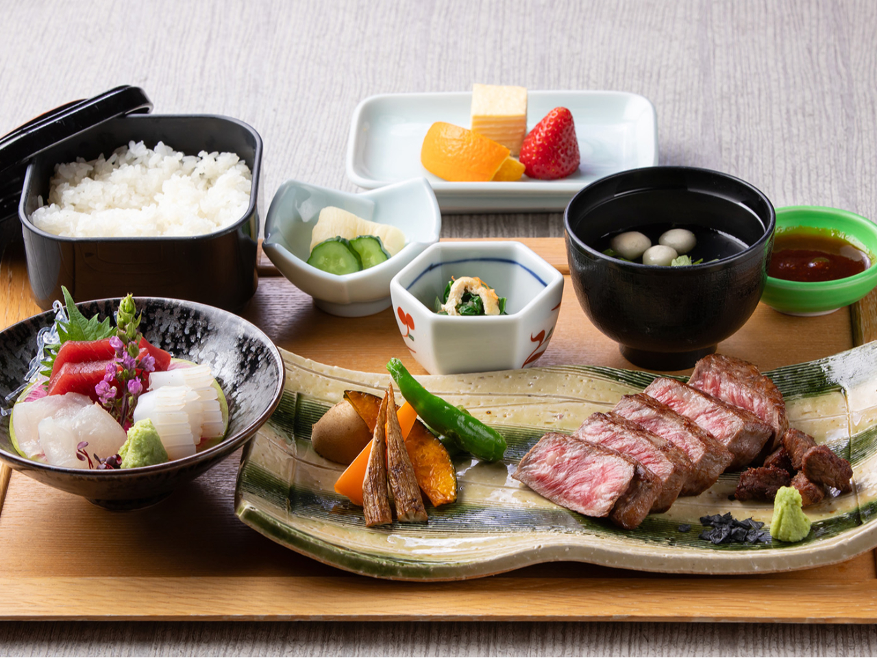 国産牛を使ったステーキ御膳。お造りも付いたお得なプランです!