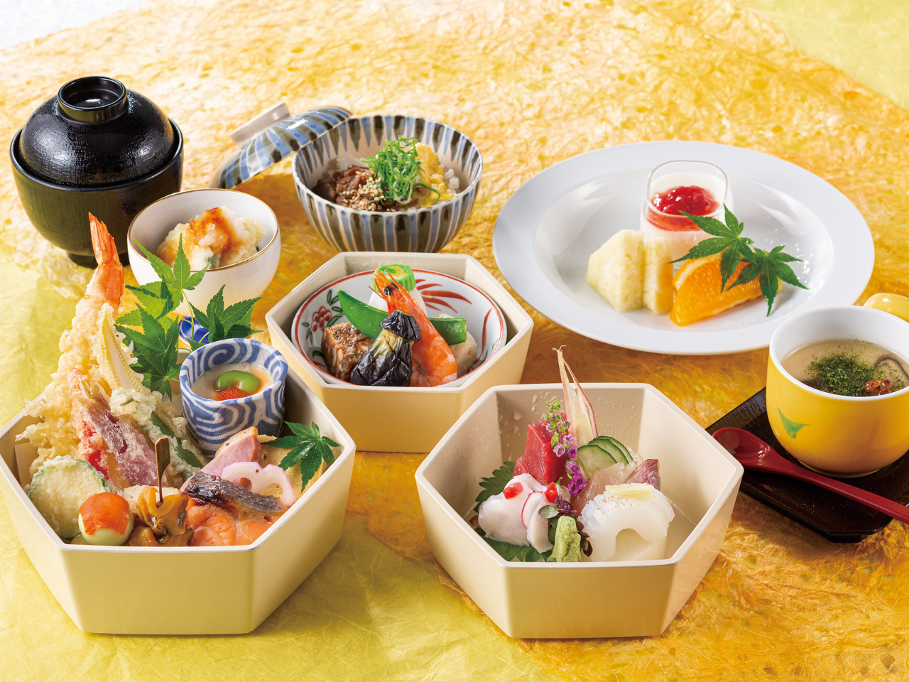 前菜やお造り、煮物、焼物、揚物、食事、水菓子に至るまで、季節の精巧な料理を堪能できる日本料理会席「雅(みやび)」です。