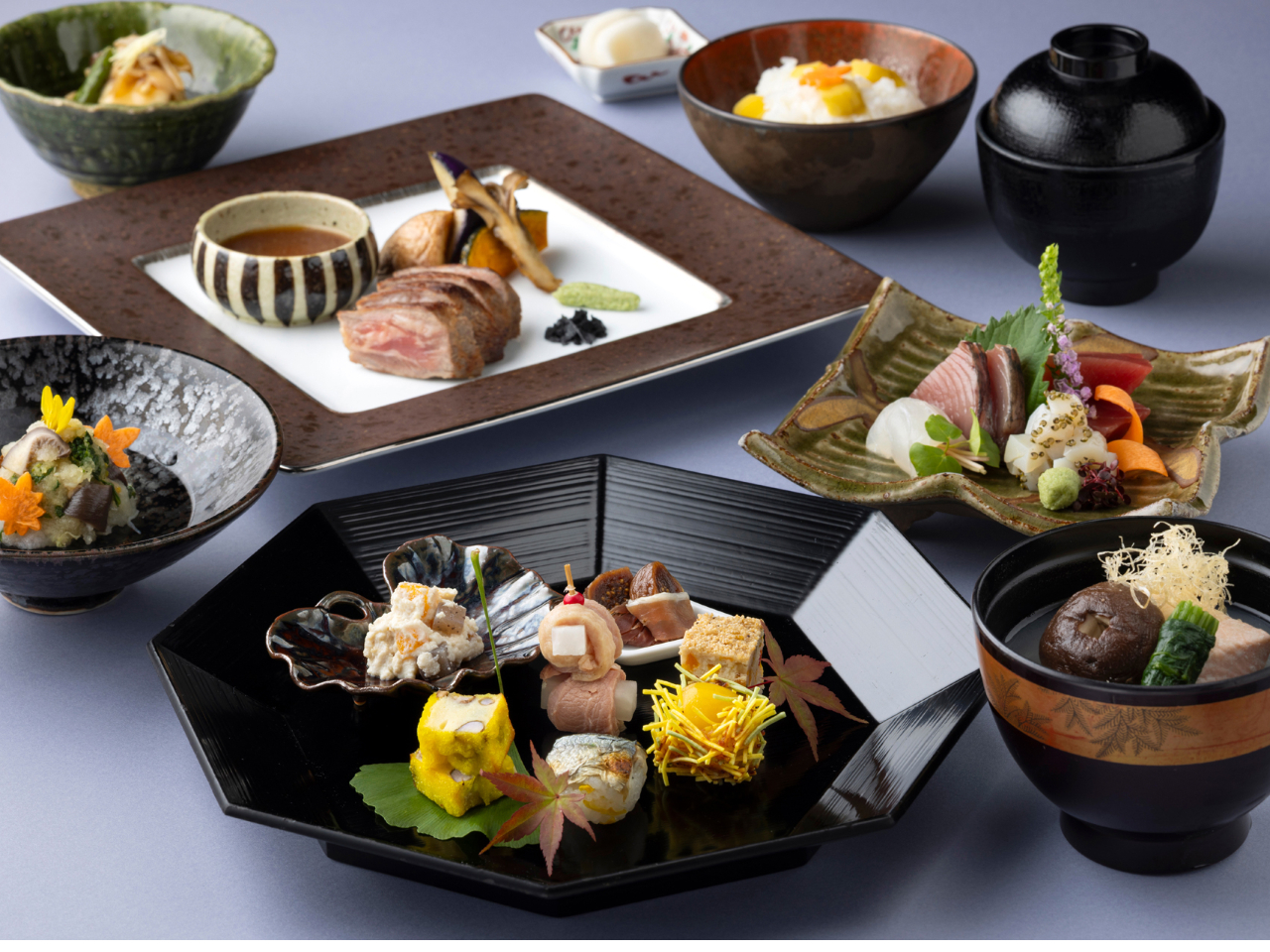 先付や前菜、あたたかい椀物、お造り、煮物、主肴、食事、水菓子と、旬の食材をふんだんに使った美しい和食のフルコースを、優雅な空間で堪能できます。