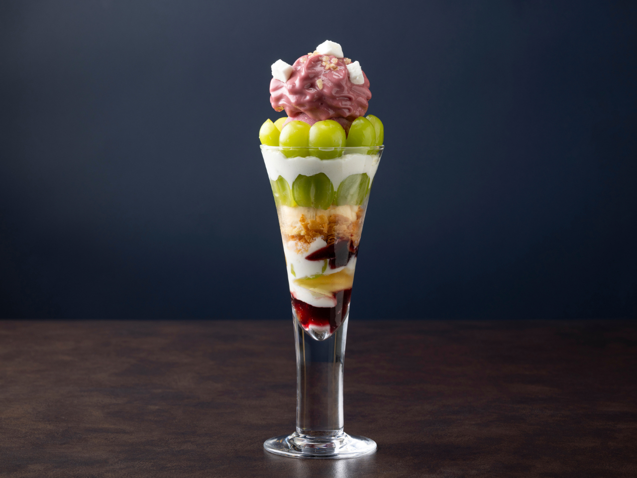 シャインマスカット、ブドウジュレ、バニラムースなどを使用したナイトパフェ