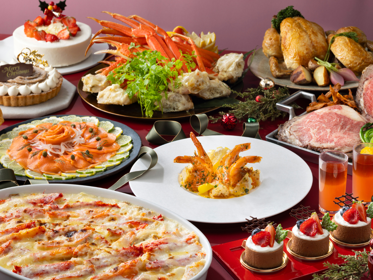 贅沢な本ズワイガニやロティサリーチキンに加え、ローストビーフやステーキなど人気の料理も揃っているのが嬉しい。大切な人とおいしい料理を囲みながら、思い出に残るクリスマスを。