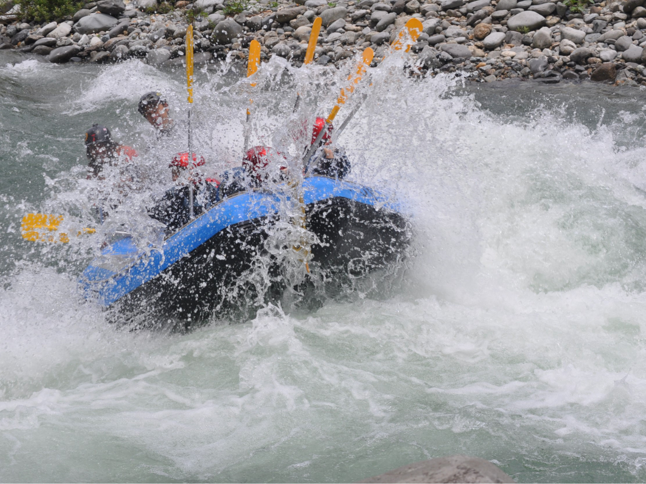 ラフティングとは8人乗りの大きなゴムボートに乗り、皆で力を合わせてパドルを漕ぎ激流を下るウォータースポーツです