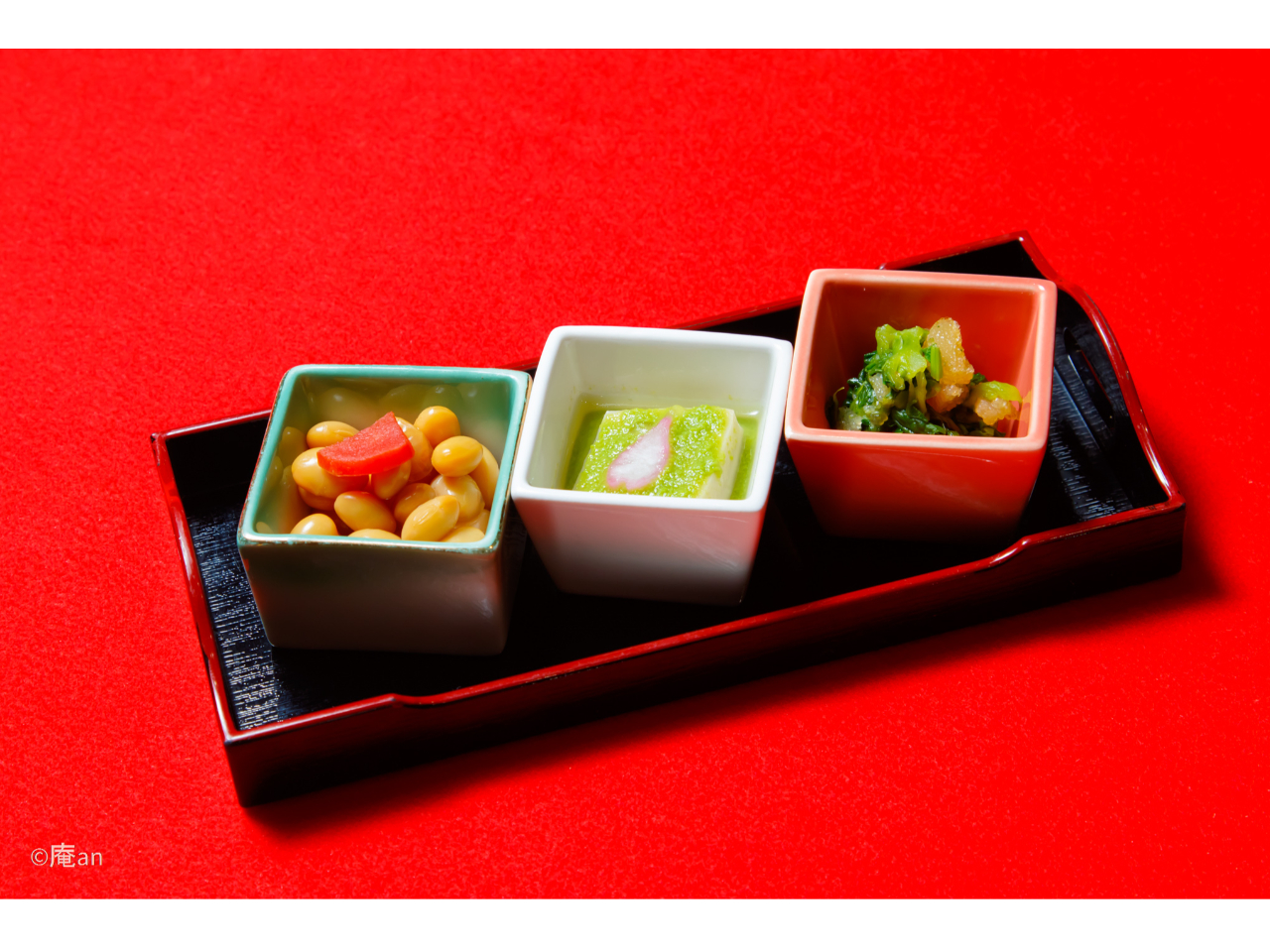 ・八寸 白酢和え、出し巻き玉子、流し羹、赤魚幽庵焼き、はじかみ、粟麩赤味噌田楽