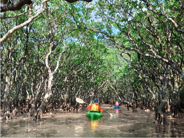 亜熱帯の干潟に広がるマングローブの森をカヌーに乗って探険したり、見て回ります。