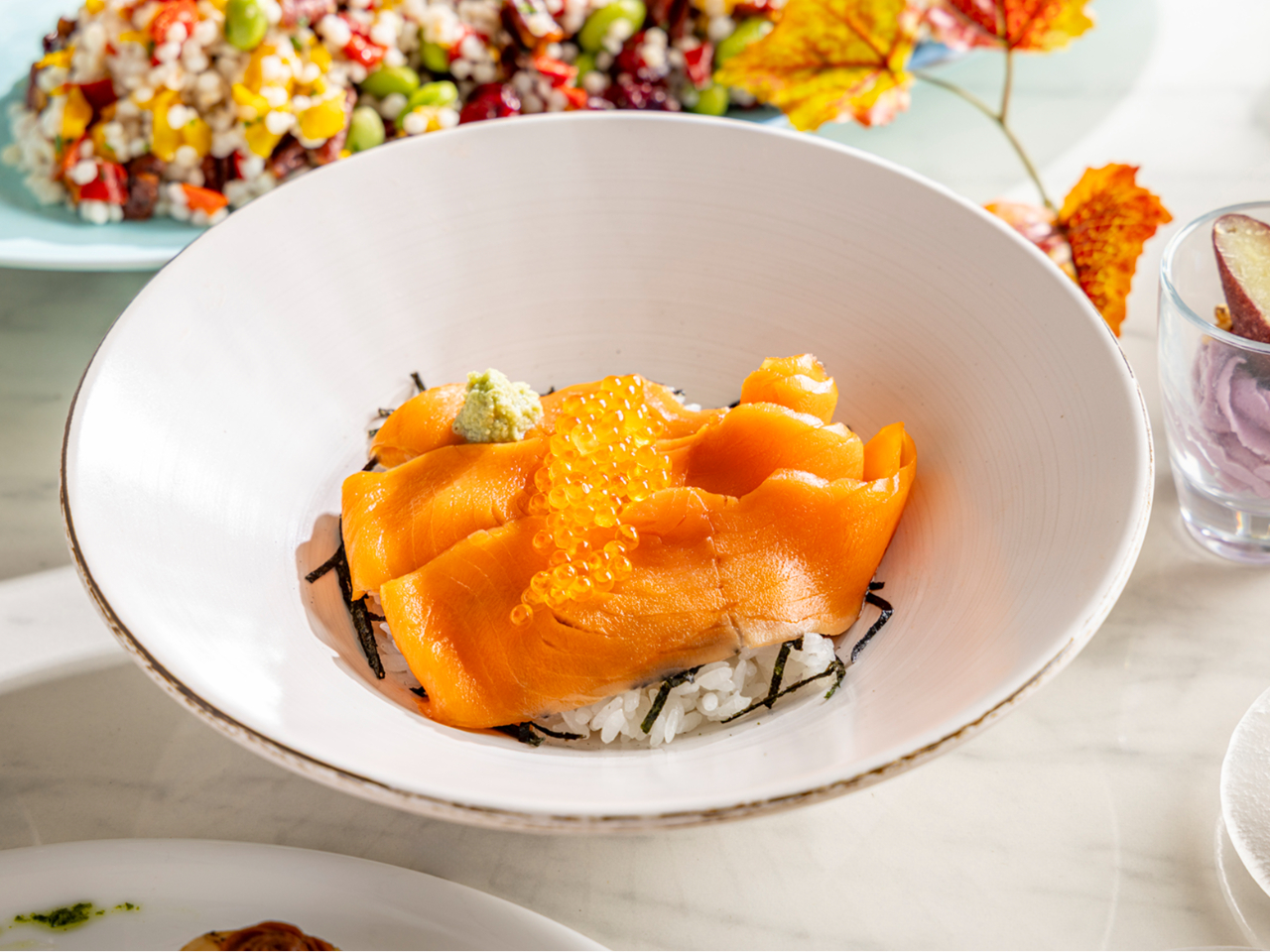 秋鮭や栗、きのこ料理に、シェフ実演のローストビーフとキャビア丼。シャインマスカットのスイーツも勢ぞろい!