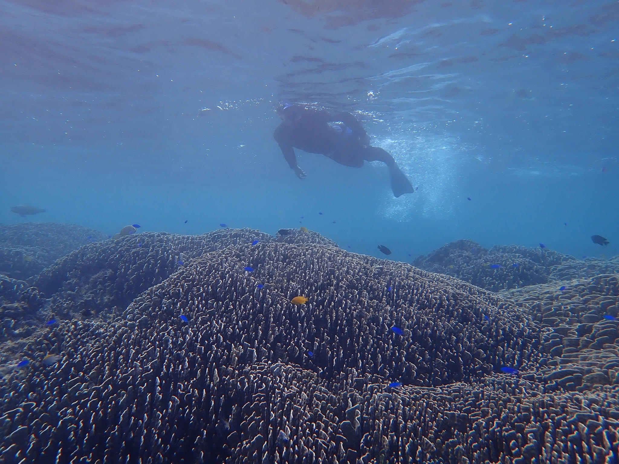 雄大な北半球最大のアオサンゴ群集合を見下ろしながら