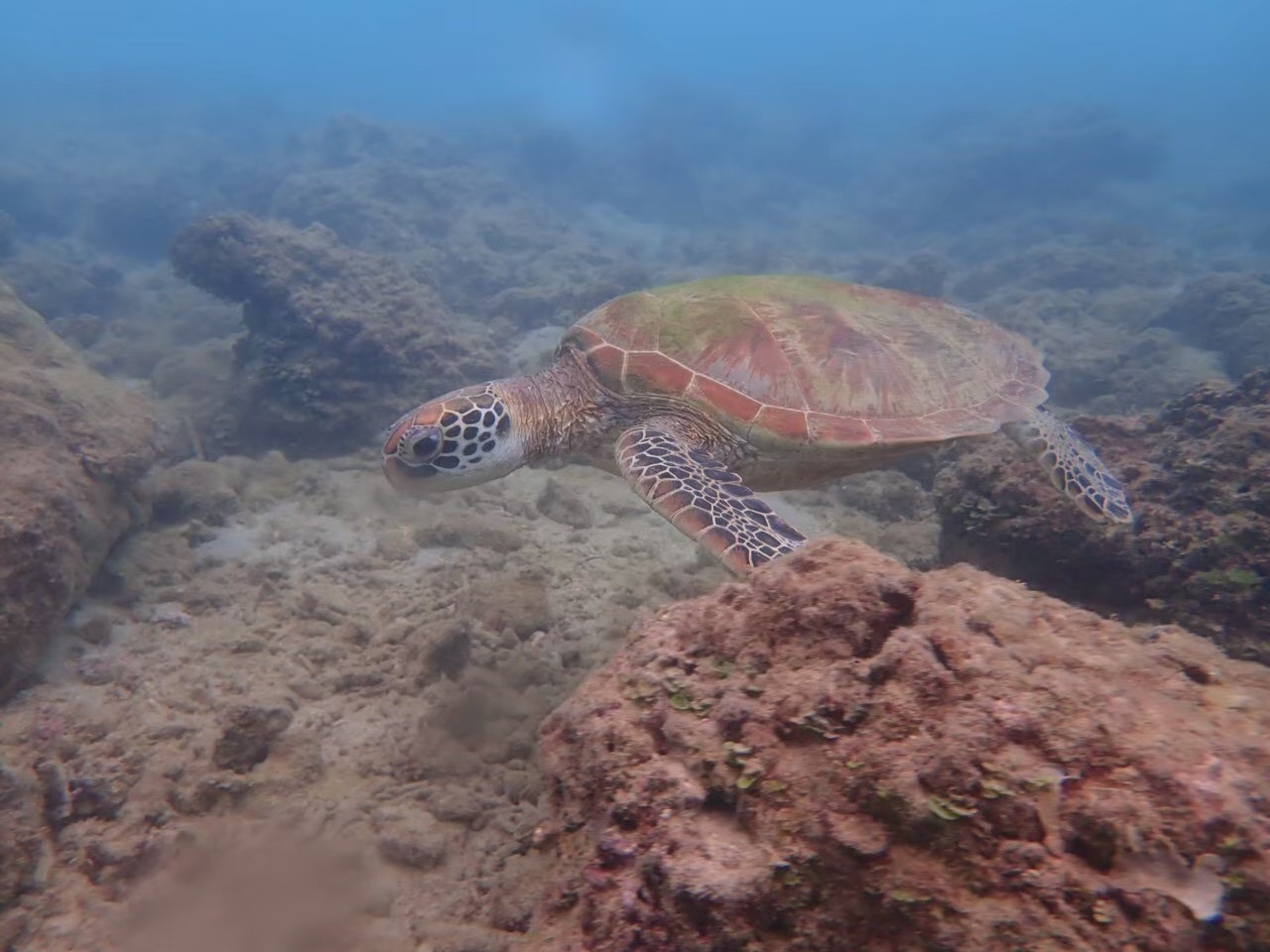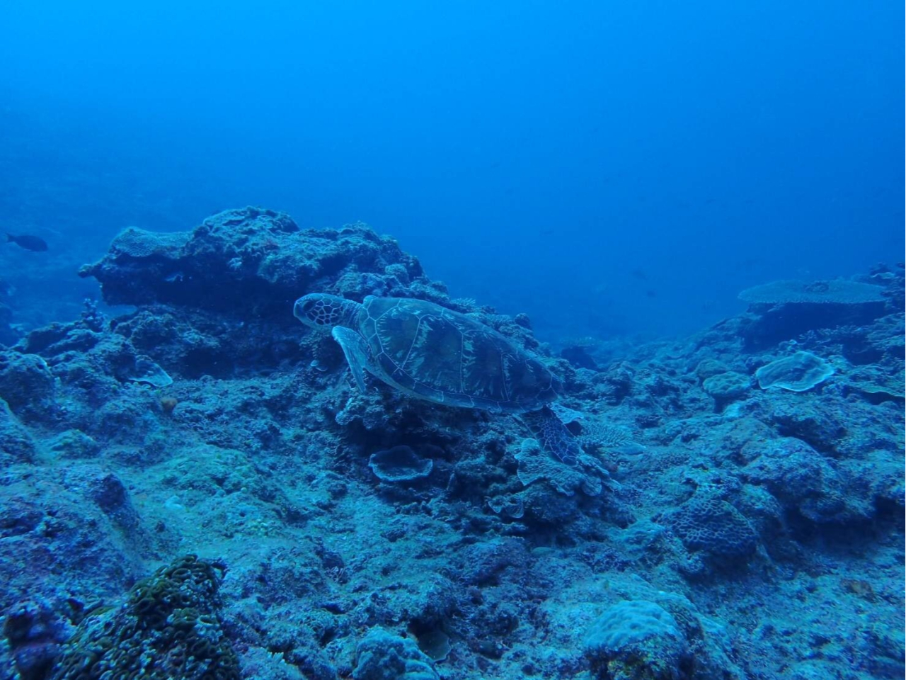 大人気のウミガメと逢えるかも!?珊瑚のお花畑でウミガメと思い出の写真撮影はいかがですか?