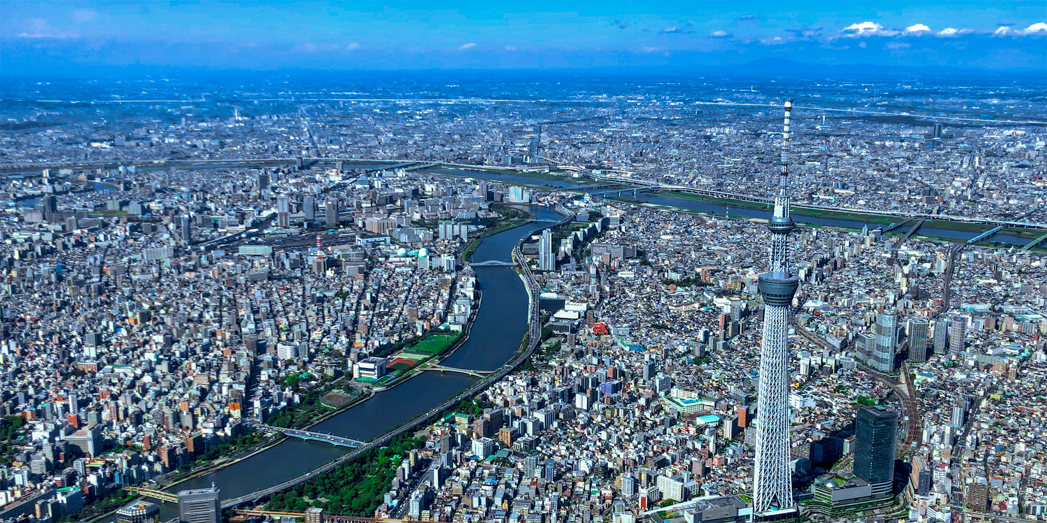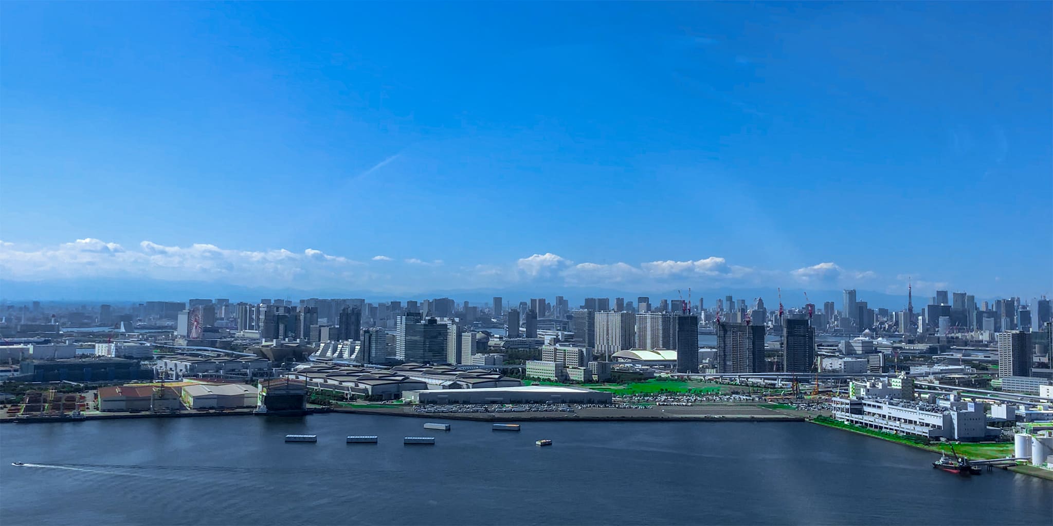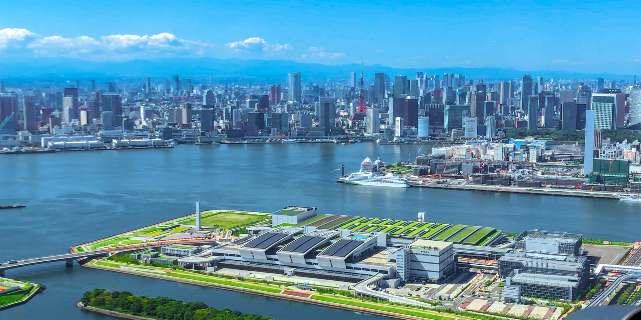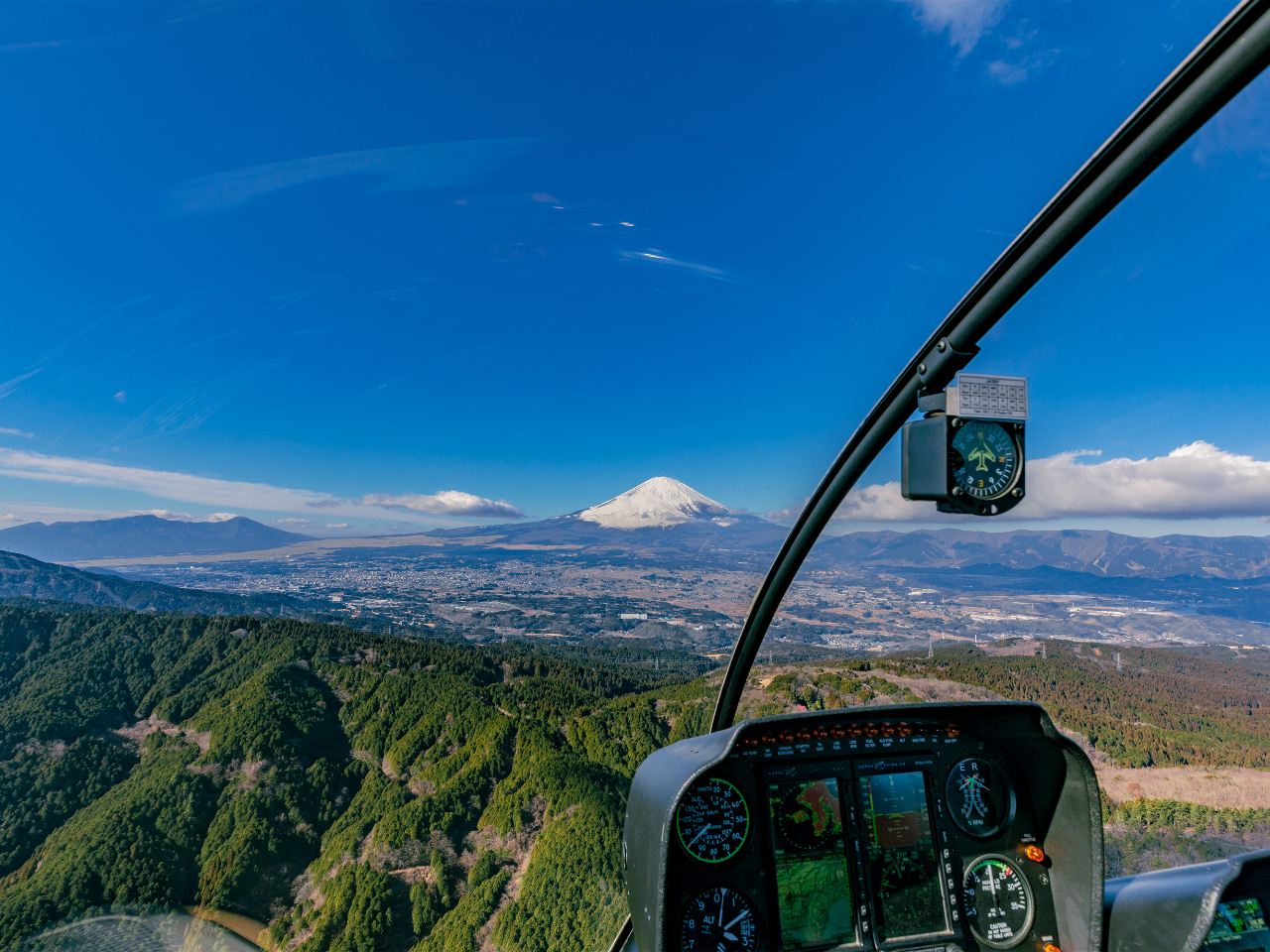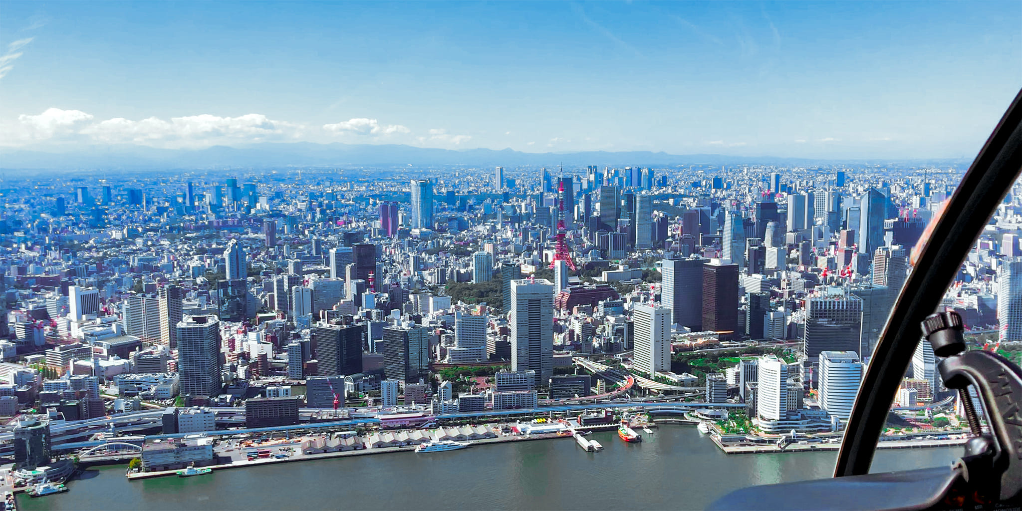 レインボーブリッジ、お台場、多摩川、みなとみらい、箱根、芦ノ湖上空を遊覧し、遠くには富士山を臨みます。