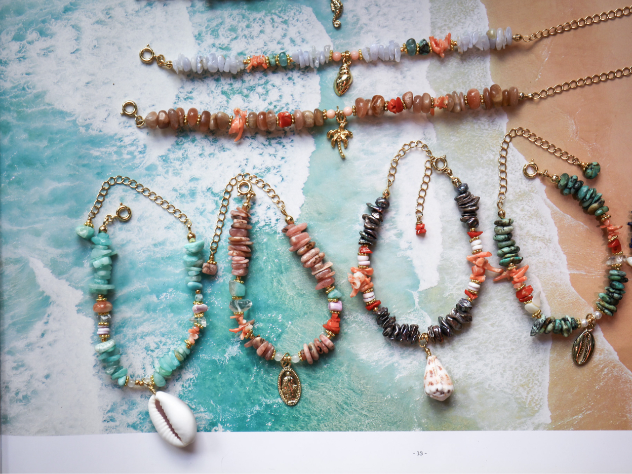 天然シェルやサンゴ、色とりどりの天然石からお好きな素材を選び、世界に一つだけのブレスレットを作成します。