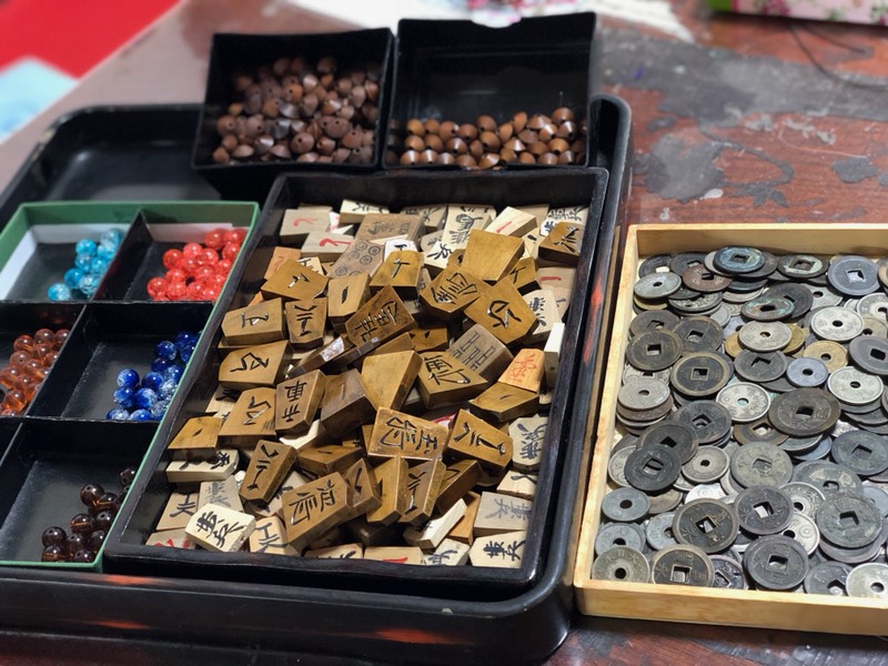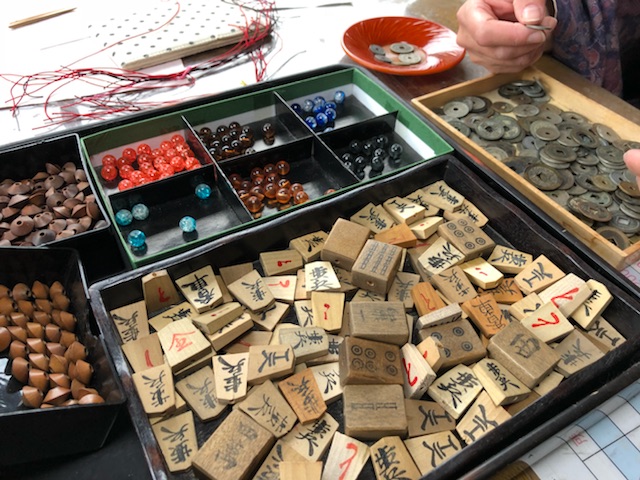 江戸時代の古銭とそろばんの玉、その間に将棋の駒、マージャンパイなどをつけて
