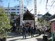 境内はあまり広くないが、鳥居の両側に多くの提灯が掛けられ、御神木の枝垂れ銀杏や茅の輪くぐりがあり、大きな雌雄の獅子やいろいろの塚などが沢山並んでいます。