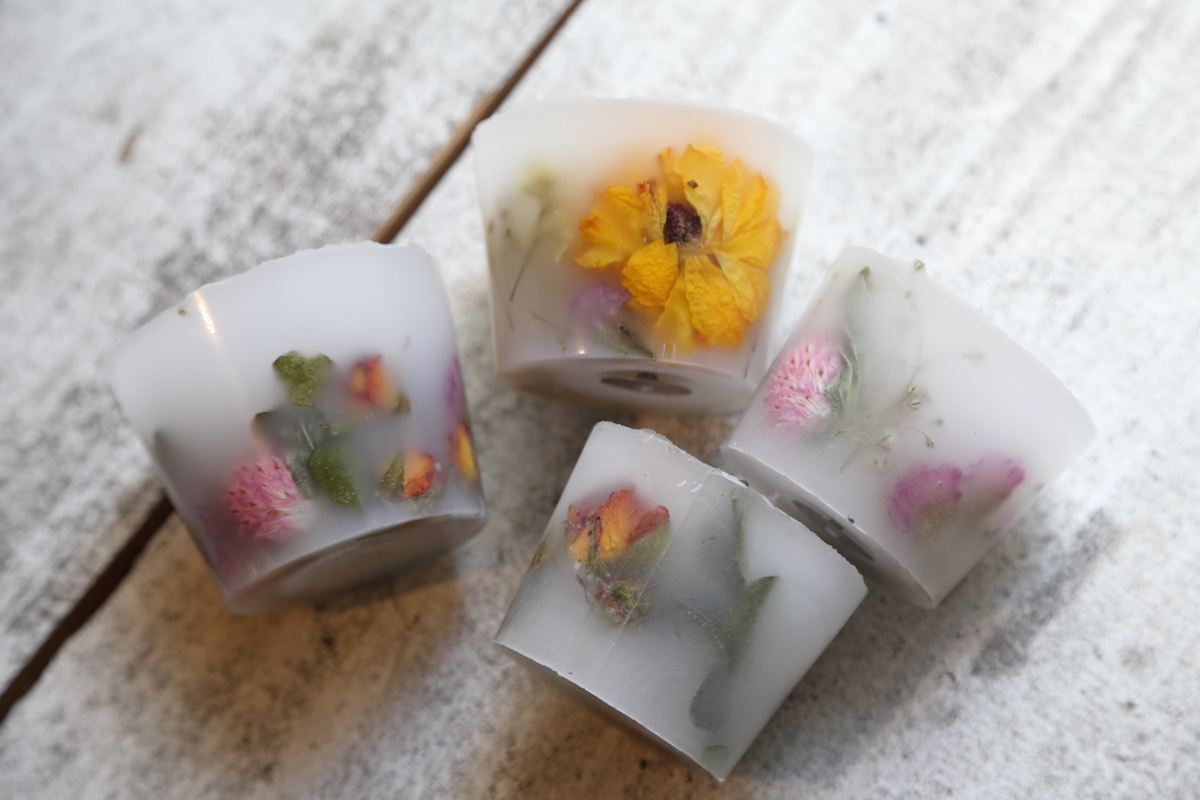 型が透明なので花の位置や色合い、密度などが見やすく、初心者でも作りやすいキャンドルです。