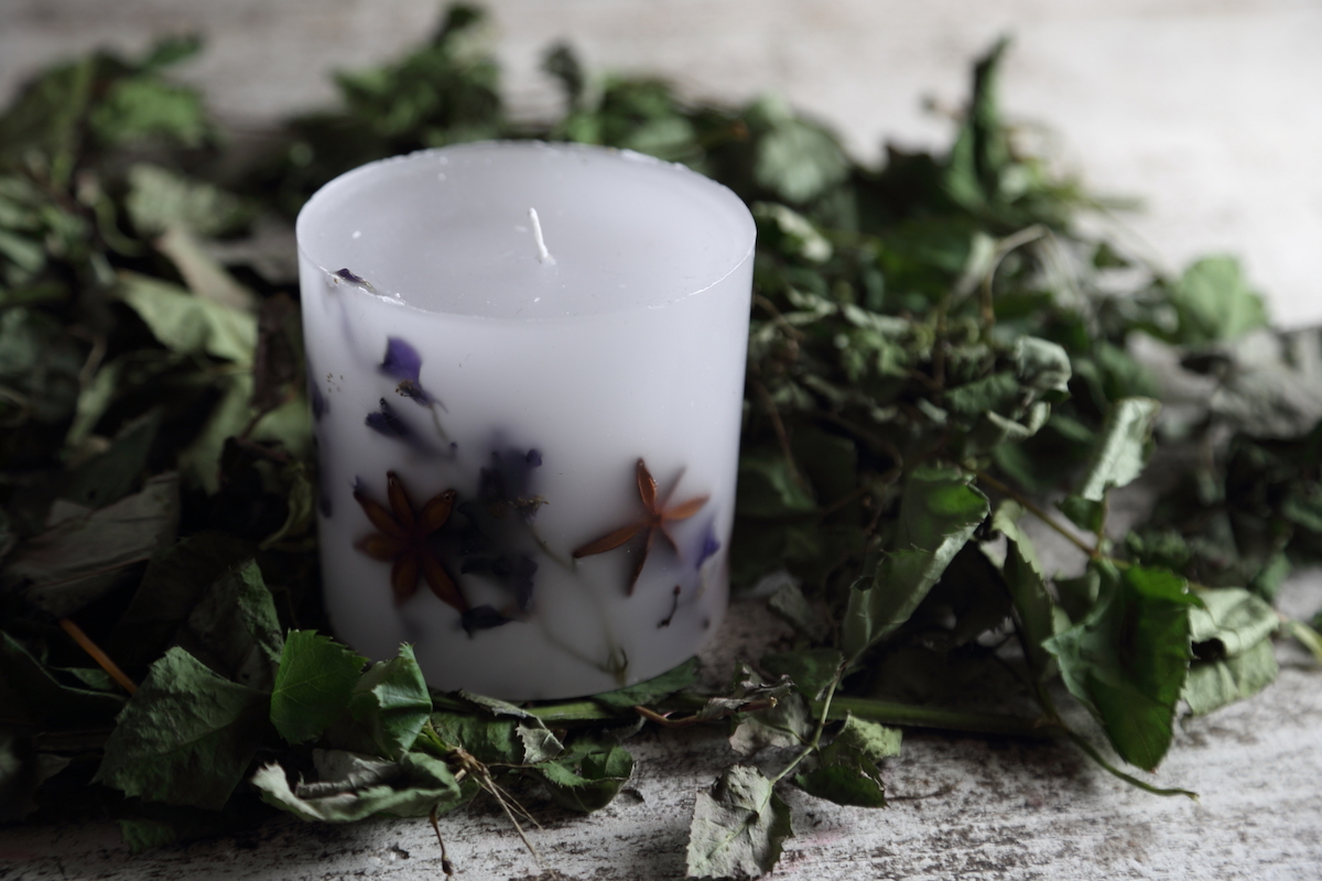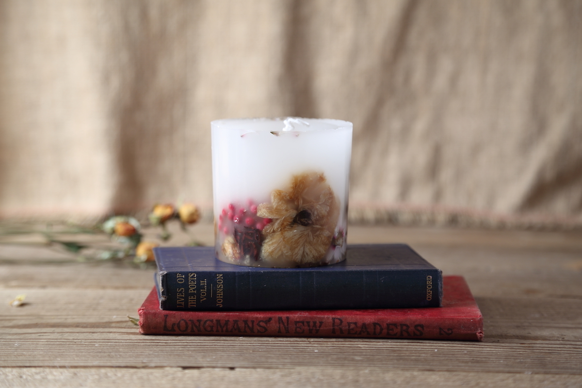 ドライフラワーをたっぷり使ったピラータイプのキャンドル。