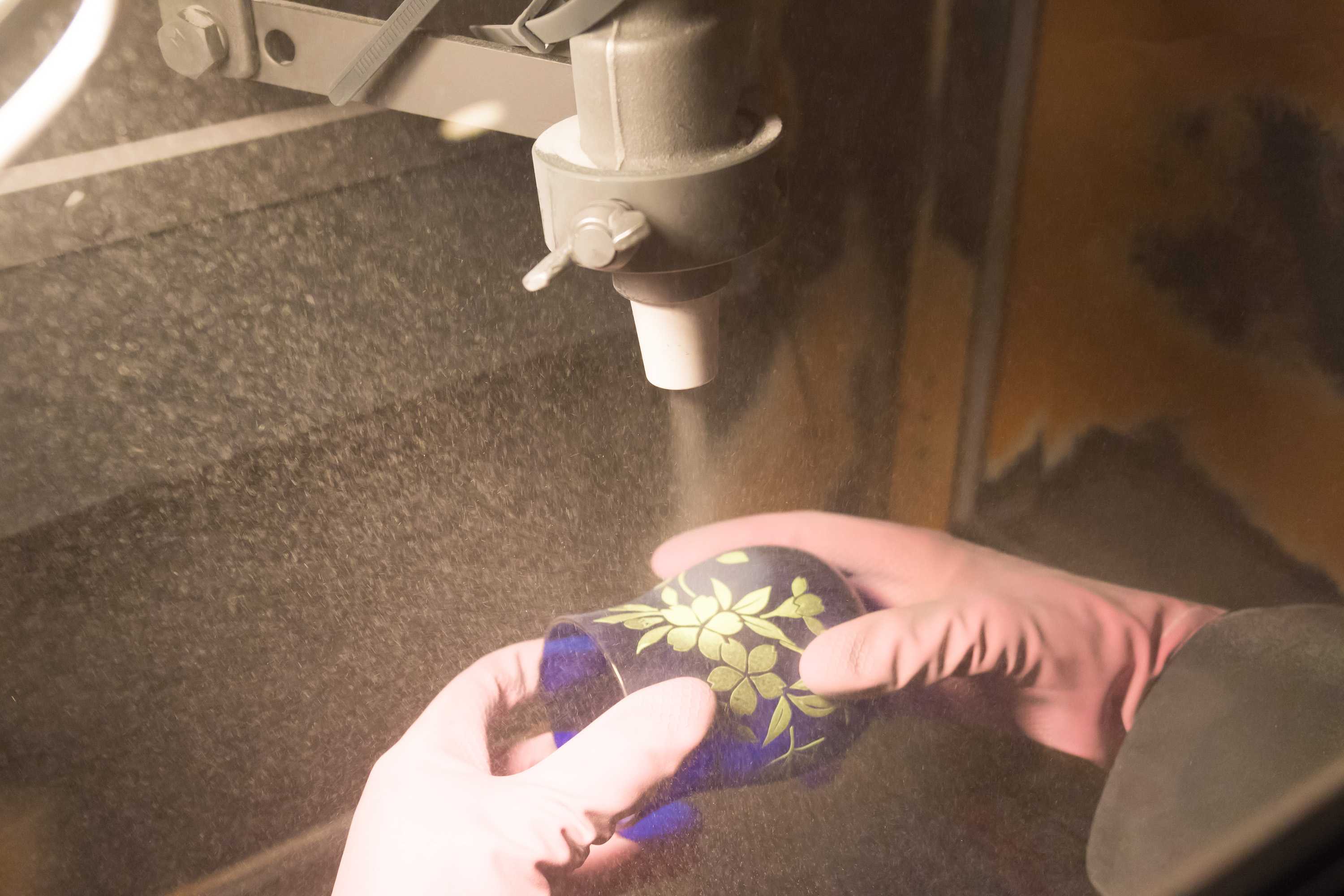 デザインシート以外の部分に砂(研磨剤)を吹きつけ、被せてある色ガラスを削り落とします。