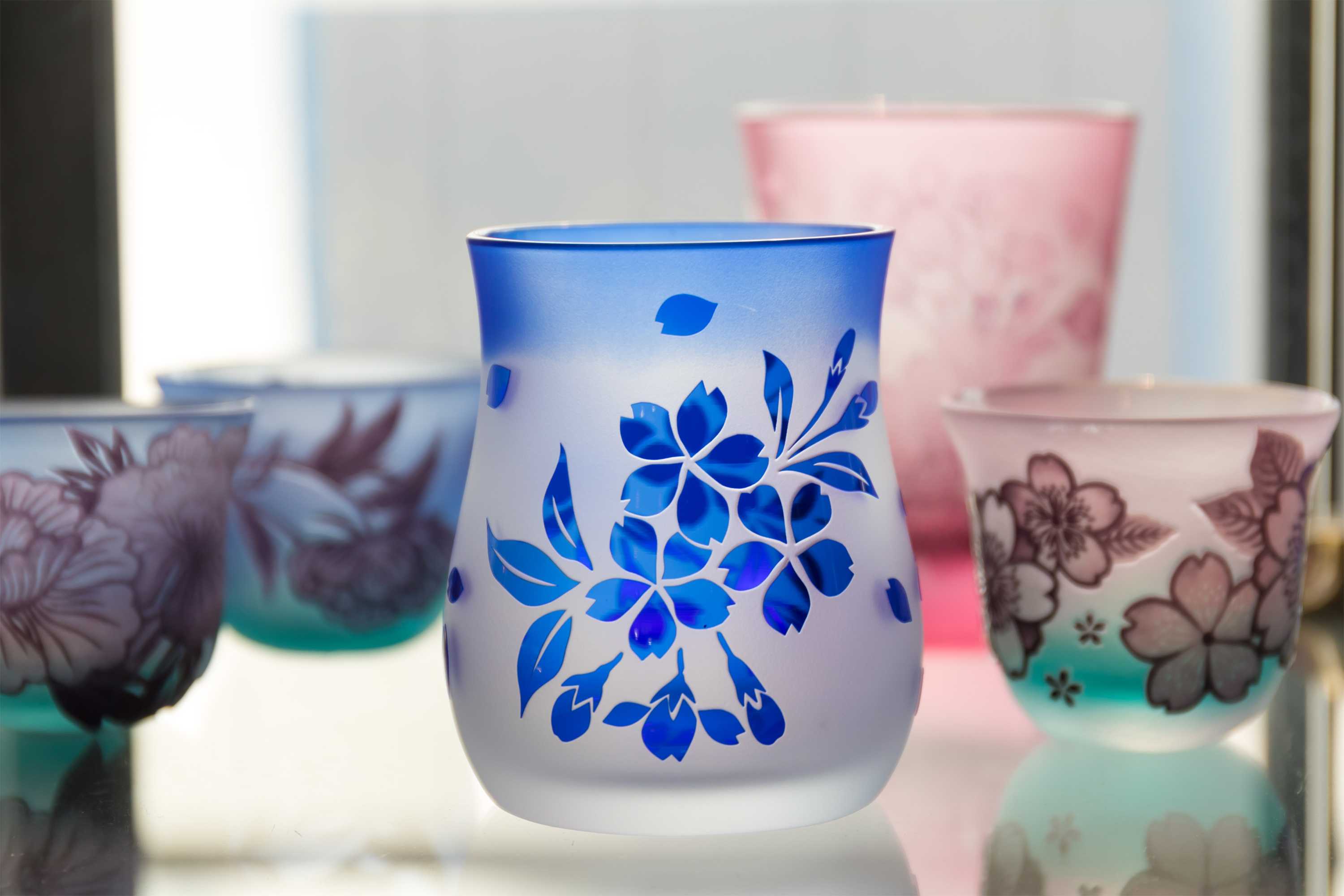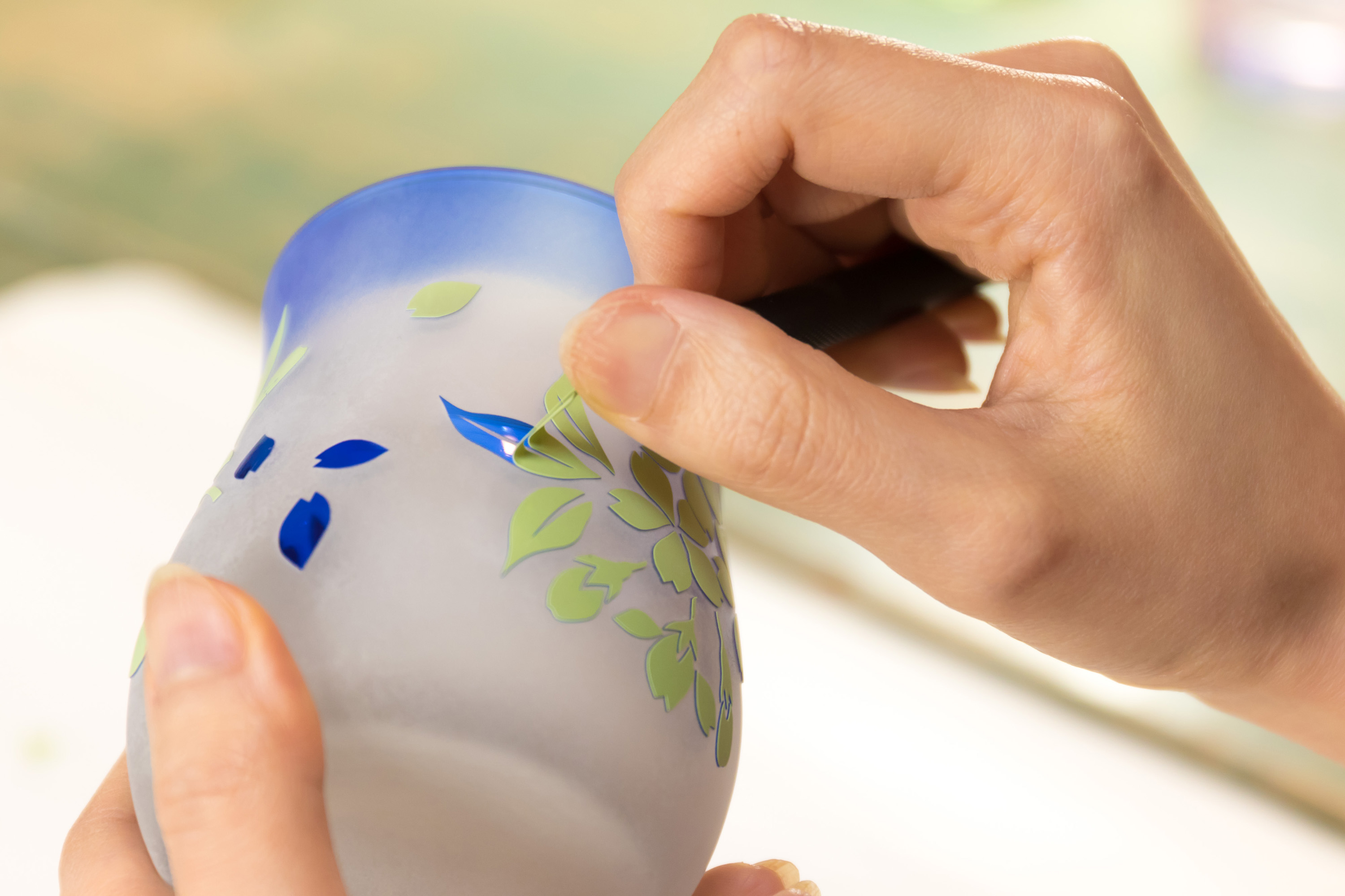 サンドブラストとは、ガラス器の表面に砂を吹き付けて彫刻を施す加工法です。
