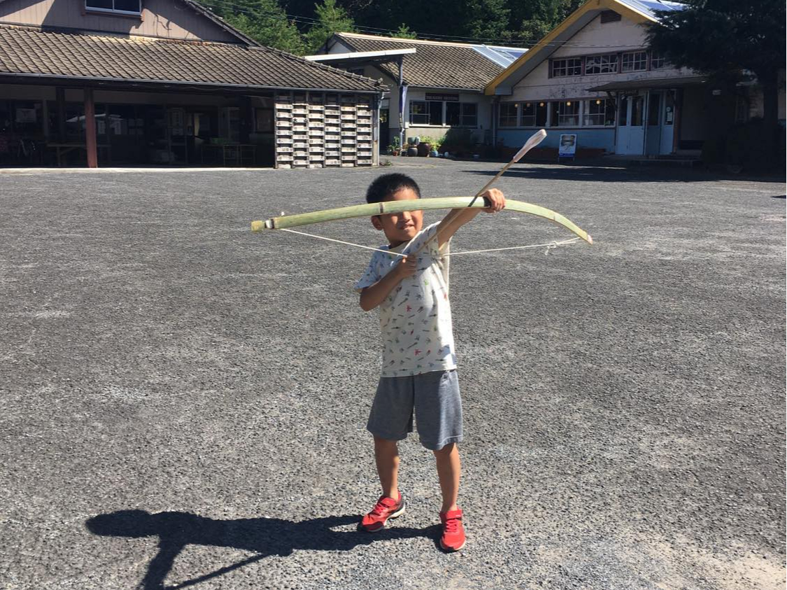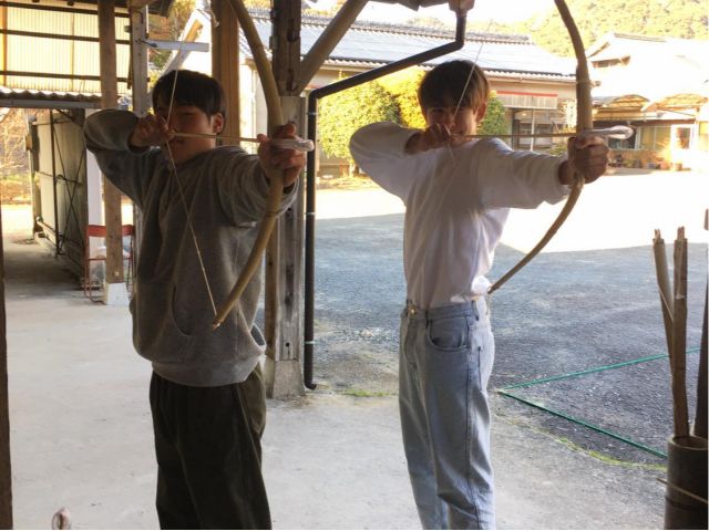 ・弓は、山林を荒らす大きな孟宗竹を、ナタやノコで切って作ったものです。