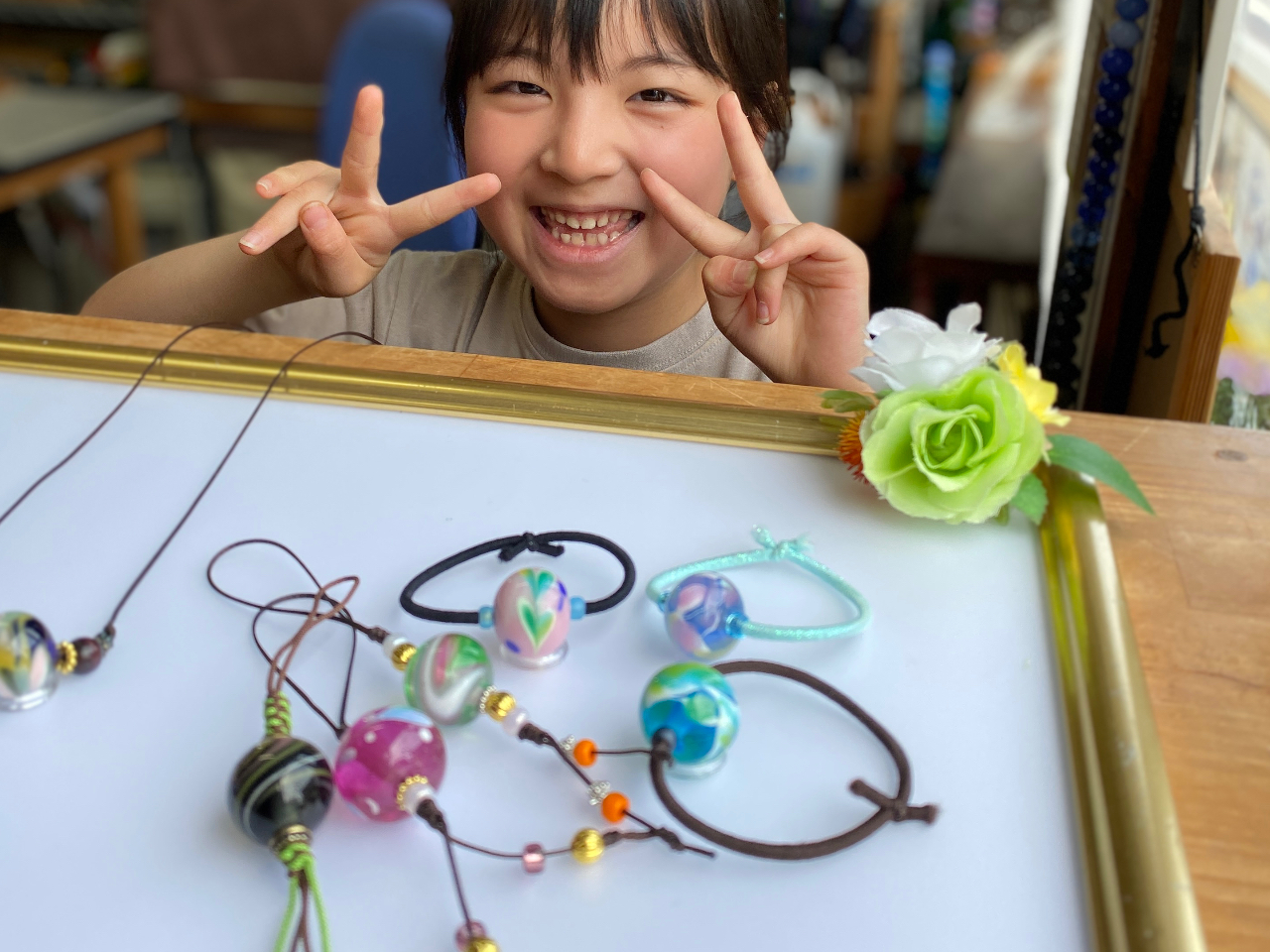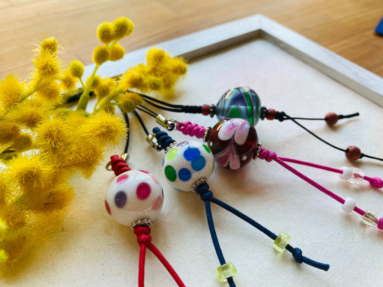 自分で作ったとんぼ玉を使ってアクセサリーやストラップなど小物作り