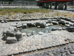 下呂温泉の有名どころであり中心部。下呂温泉から中心街に行くと現れる橋で、手前に降りた川沿いに下呂温泉名物「噴泉池」がある。午前11:00誰もいなかった。先日の大雨では川の増水で浸水したらしいが、綺麗に清掃されていた。