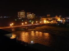 街灯がついた大きな橋です。橋を渡りながら川を眺めます。欄干には白鷺の模様があります。