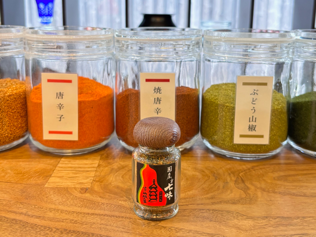 壁一面に看板商品の国産京七味を展示しています。