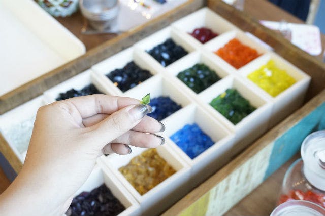 ・お好きなカラーのガラス板をお選びいただき、ランプベースに貼付けていきます