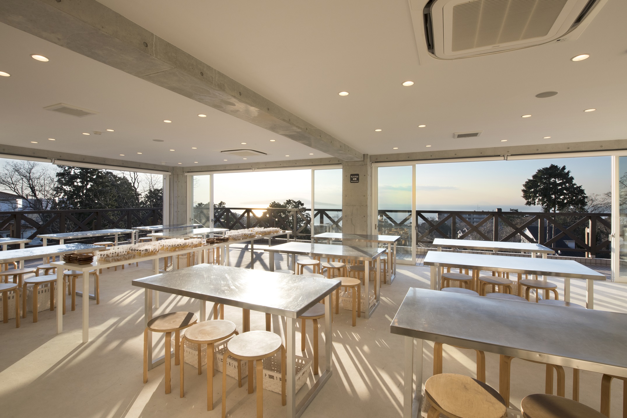 リニューアルしたばかりの体験工房。創作意欲が湧きそうな海を一望できる大きな窓が特徴。吹きガラスやサンドブラスト、とんぼ玉体験もできる。