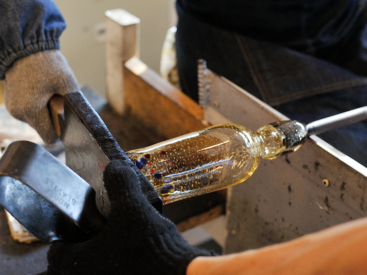 溶けたガラスを自由自在に操るクラフトマン達と一緒に作るグラス制作は、