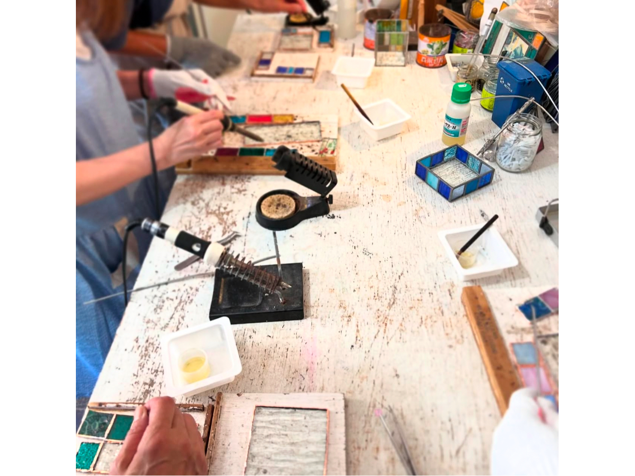 色とりどりの長方形の色ガラスから5枚選んで銅テープ貼りからハンダ付けを体験できる1時間半コース。ヘアアクセサリー以外にもアイディアがあればアレンジOK!