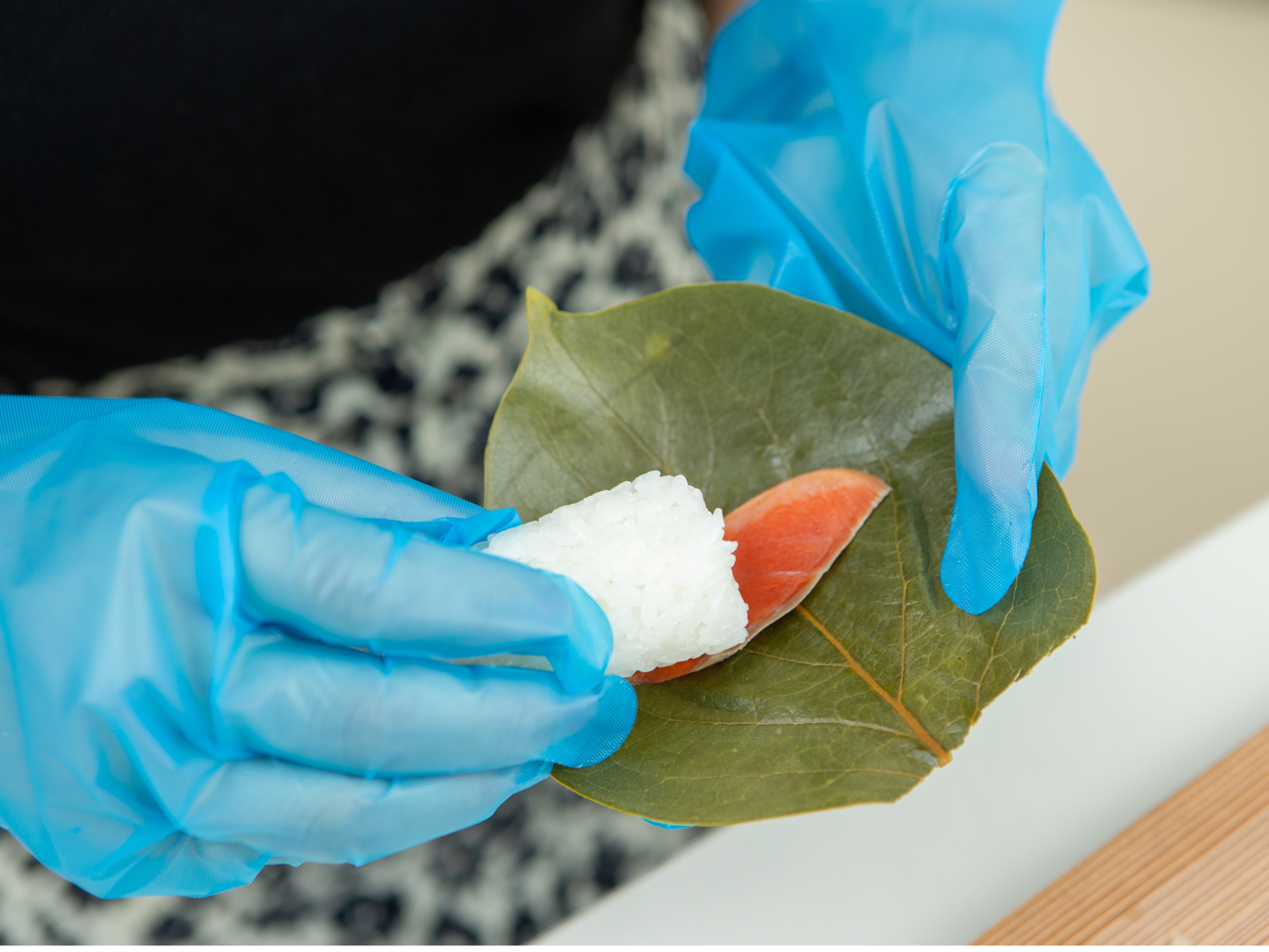 海のめぐみ(さば)、山のめぐみ(柿)、地のめぐみ(米)に感謝をし、愛情を込めてご飯をにぎり、真心を込めて柿の葉で包む。