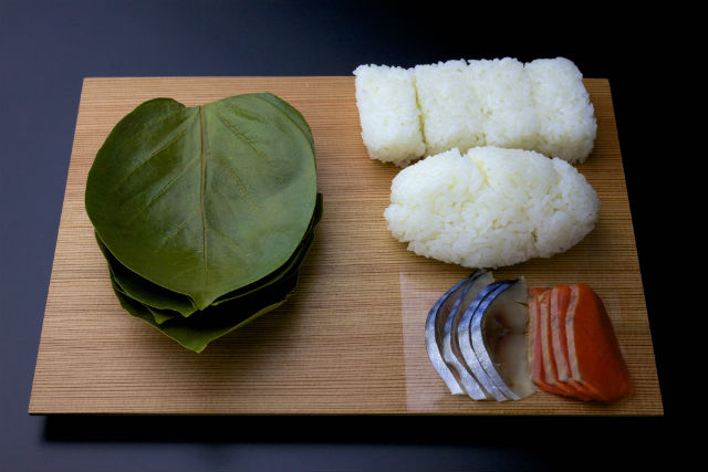 鯖や鮭などのお寿司を柿の葉でくるんだ食べ物です。