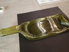 雰囲気のよいお店のなかでの体験教室です。使うガラス製品はお店の中から好きに選んで購入。私はアウトレット品のワイングラス皿を選びました。そこに薬剤を使ってエッチング。用意されているたくさんの絵柄の中から一つを選びます(私は花柄を選びました)。薬剤を塗って洗うだけの簡単な作業でした。自宅でも楽しむために、体験後にはエッチングクリームを買って帰りました。