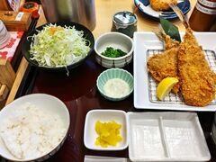 まだ幼稚園遊具はセッティング中で立ち入れず、飲食店がいくつかあり、美味しそうな大金鯵の看板に誘われ保田食堂に入りました。でも時間がかかりそうだったので変更して、隣の「なのはなぐみ かつ菜保田店」へ、そこは大金鯵ではなかったけれども肉厚の大きな鰺フライがあり、とてもおいしかったです。