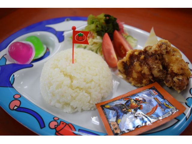 お子さまに人気のカレーらいす・エビフライ・唐揚げ・デザートをワンプレートにしました