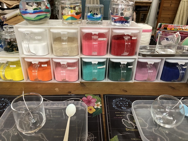 キャンドルの中には海岸で見つけたお気に入りのサンゴや貝殻の他、お店にカラーサンド以外にも宮古島のきめ細やかな砂も用意されています。旅の思い出になる物を手作りできる事が最大の魅力です。