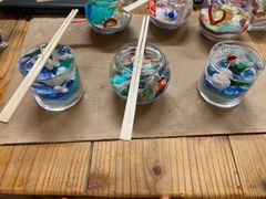 流し込んだ透明なロウを冷ましているところです。有料ですがガラス製の魚などのキャラクターも入れられます